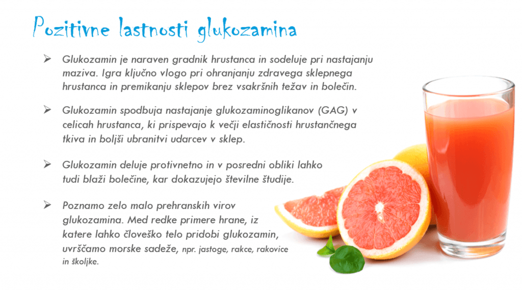 Je derivat glukoze, ki se tvori v telesu in ga v manjših količanah najdemo tudi v hrani. Glukozamin hidroklorid je izredno pomemben pri vzdrževanju hrustanca, gelu podobne snovi, ki obkroža naše sklepe. Če ga jemljemo kot prehrambeni dodatek, olajša bolečine, togost in otekline, ki nastanejo pri osteoartritisu in revmatoidnem artritisu, vnetju sklepov in vretenc, kit, vezi, mišic in poškodbah tkiva. Ker glukozamin hidroklorid pomaga pri krepitvi hrustanca, pomaga s tem pri zdravljenju izpahov in zvinov gležnjev ter prstov. Enako velja za poškodbe mišic. S tem ko krepi sklepe, pomaga glukozamin tudi preprečevati bodoče poškodbe.